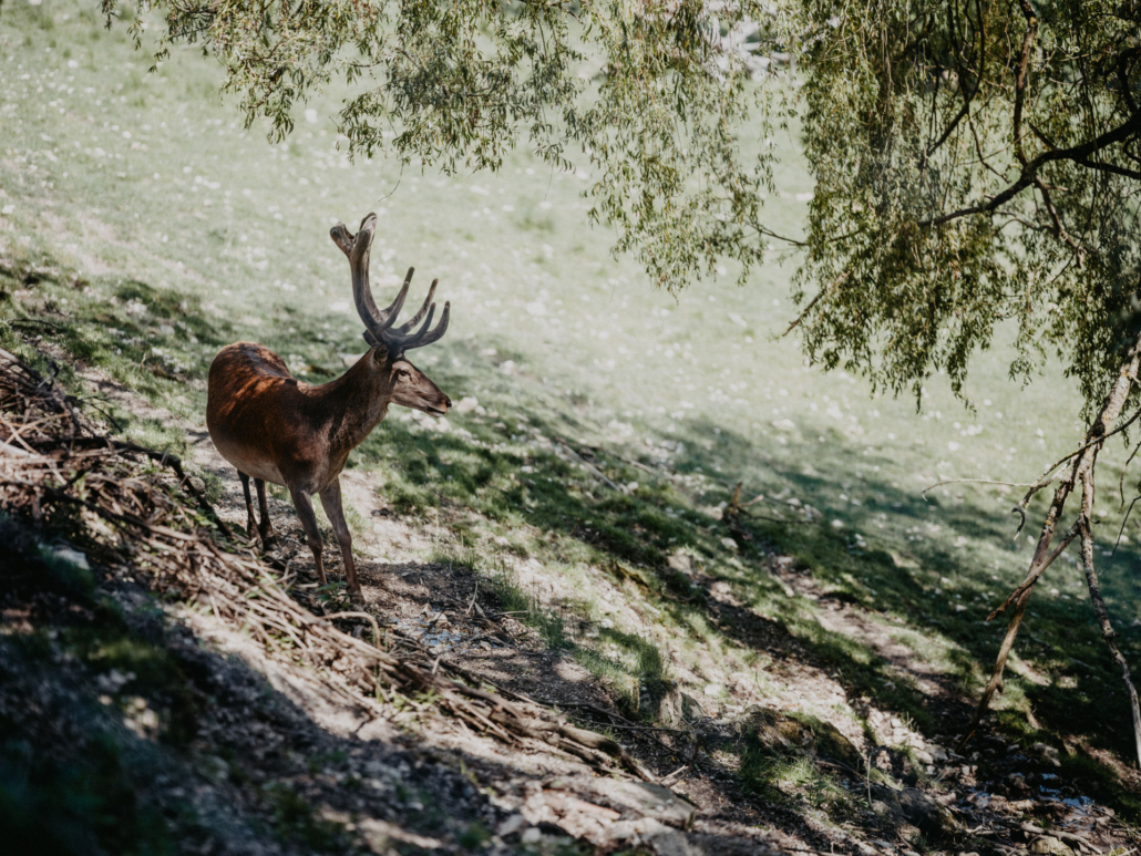 In unserem 9 Hektar großen Gehege haben unsere Dam- und Rothirsche mit ihren Tieren und ihren Kälbern Winter wie Sommer optimale Bewegungsfreiheit und Auslauf in Hülle und Fülle.